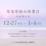 誠に勝手ながら12月27日(土)から1月4日(日)の期間、年末年始休業とさせていただきます。